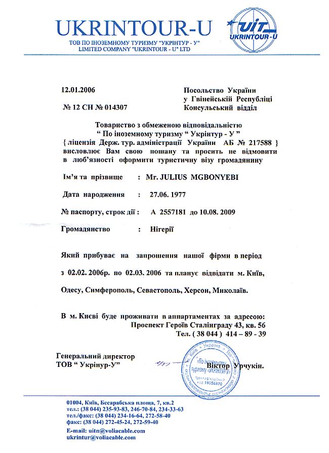 Invitation letter for Ukrainian visa